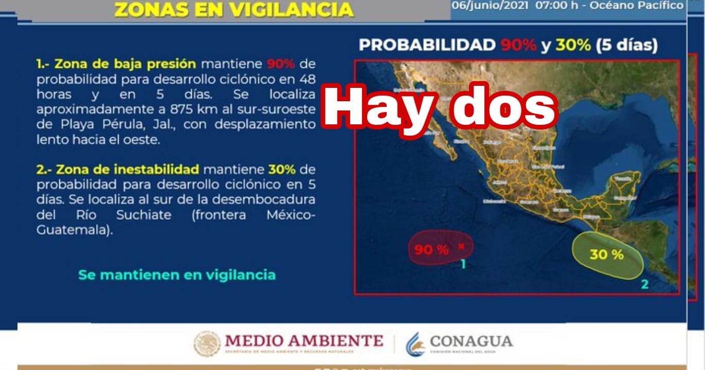 México, junio 6 del 2021.- La zona de baja presión en el océano pacifico está a punto de ser ciclón tropical y de forma simultanea se formó una segunda zona de inestabilidad que registra el treinta por ciento de desarrollo en los siguientes dias.