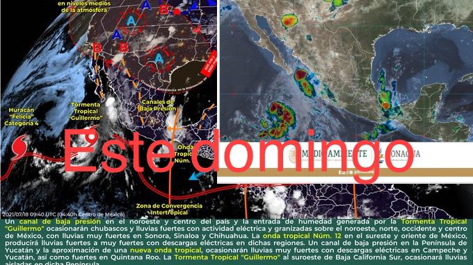 México; julio 18 del 2021.- Para hoy, un canal de baja presión se extenderá desde el noroeste hasta el centro del país, interaccionará con inestabilidad atmosférica superior y con la entrada de humedad generada por la circulación de la tormenta tropical “Guillermo” en el Océano Pacífico, ocasionando chubascos y lluvias fuertes acompañadas de actividad eléctrica y posibles granizadas sobre los estados del noroeste, norte, occidente y centro de México, con lluvias puntuales muy fuertes en Sonora, Sinaloa y Chihuahua.