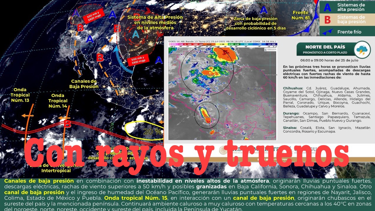 México; julio 25 del 2021.- Este día, canales de baja presión sobre la Península de Baja California y noroeste de México en combinación con inestabilidad en niveles altos de la atmósfera, originarán lluvias puntuales fuertes, descargas eléctricas, rachas de viento superiores a 50 km/h y posibles granizadas en Baja California, Sonora, Chihuahua y Sinaloa.
