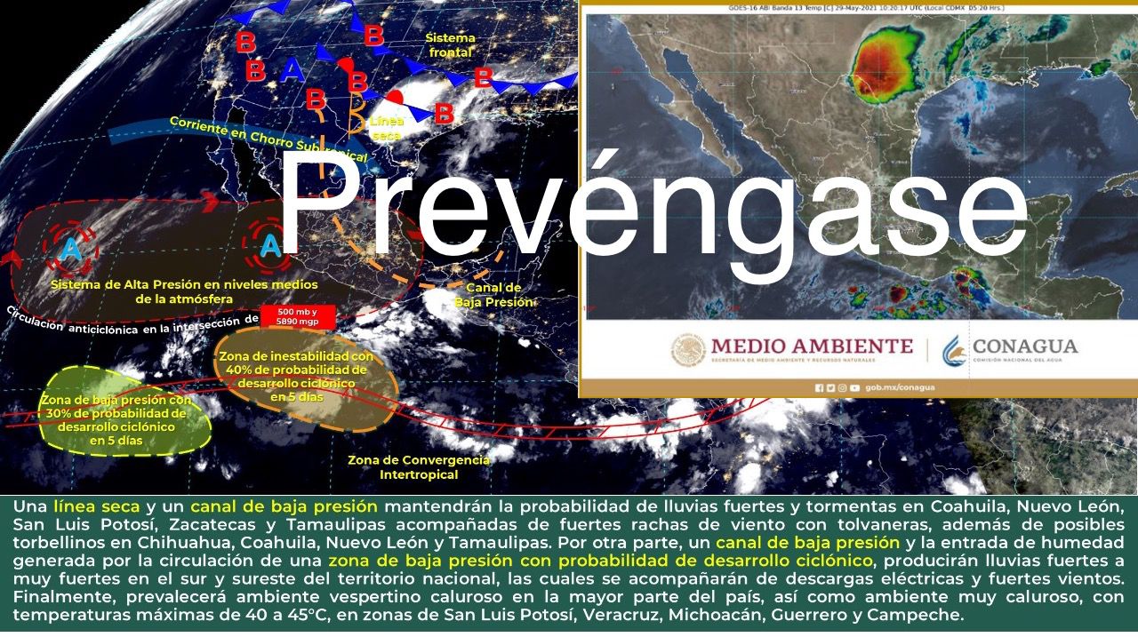 México; mayo 29 del 2021.- Para hoy, una línea seca y un canal de baja presión permanecerán sobre el norte del territorio nacional y mantendrán la probabilidad de lluvias fuertes y tormentas en Coahuila, Nuevo León, San Luis Potosí, Zacatecas y Tamaulipas acompañadas de fuertes rachas de viento con tolvaneras, además de posibles torbellinos en Chihuahua, Coahuila, Nuevo León y Tamaulipas.