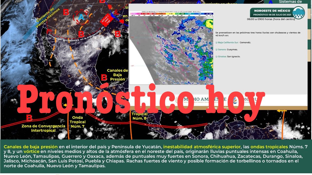 México; julio 06 del 2021.- Para hoy, el país será afectado por los siguientes sistemas meteorológicos: canales de baja presión sobre el interior del país y Península de Yucatán, inestabilidad atmosférica superior, el paso de las ondas tropicales Núms. 7 y 8, y un vórtice en niveles medios y altos de la atmósfera en el noreste del país.