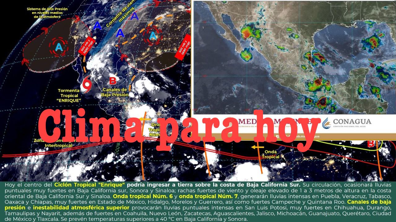 México; junio 30 del 2021.- Para hoy, el ciclón tropical “Enrique” que se localizará al sureste de Baja California Sur, inestabilidad atmosférica superior, la onda tropical Número 6 al occidente del territorio nacional, un canal de baja presión en el interior del país y la onda tropical Número 7, en el sureste del territorio nacional, favorecerán lluvias puntuales intensas en San Luis Potosí, Puebla, Veracruz, Tabasco, Oaxaca y Chiapas; puntuales muy fuertes en Baja California Sur, Sonora, Sinaloa, Chihuahua, Durango, Tamaulipas, Estado de México, Hidalgo, Morelos, Nayarit y Guerrero.